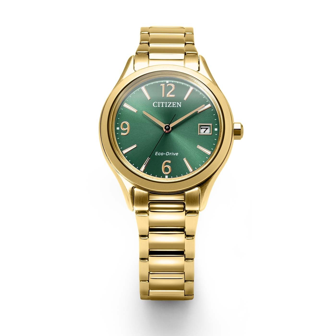 Eine goldene Citizen Eco-Drive Uhr mit grünem Zifferblatt.